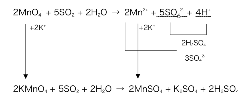 そして、硫酸酸性条件下だったため、H+はすべてH2SO4由来であるので、そこも戻してあげる。あとは残った+と-のイオンを組み合わせてあげればよい。