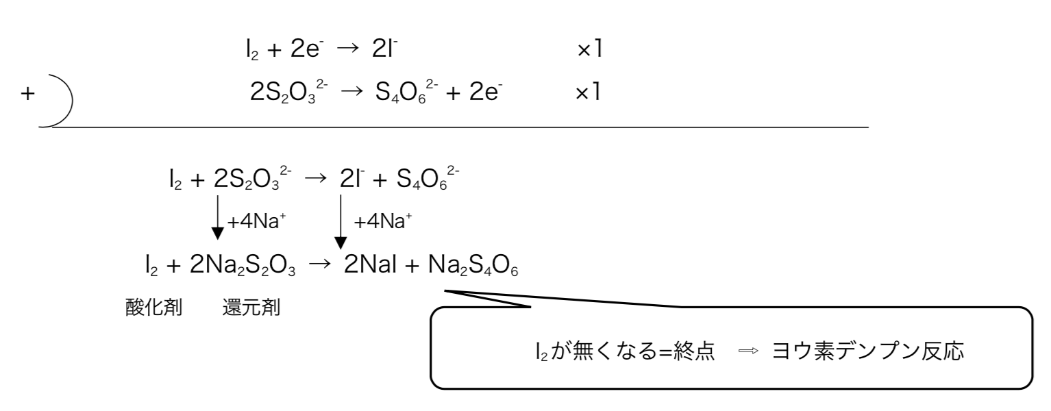 出てきたI2を酸化剤として、還元剤で濃度既知のチオ硫酸ナトリウムNa2S2O3により滴定する。この際、デンプンを入れヨウ素デンプン反応によって青紫色が消えた点を終点とする。