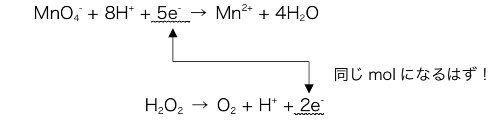 e–の授受は余りなく完全に行われるので、2つの半反応式においてe–のmolは等しくならなければならない。