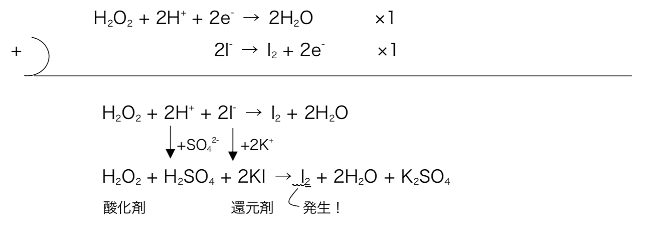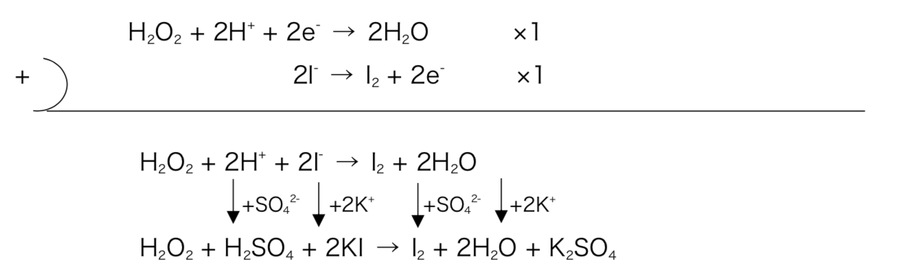 - Ex)ヨウ化カリウム水溶液と過酸化水素を硫酸酸性条件下で作用させた時の化学反応式を記せ。