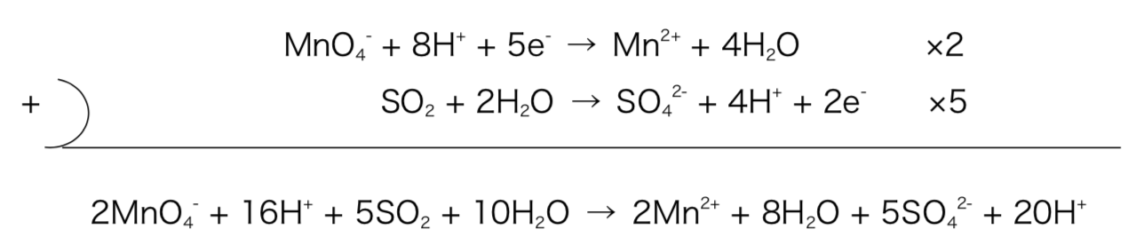 SO2 + 2H2O → SO42- + 4H+ + 2e– (還元剤の半反応式)