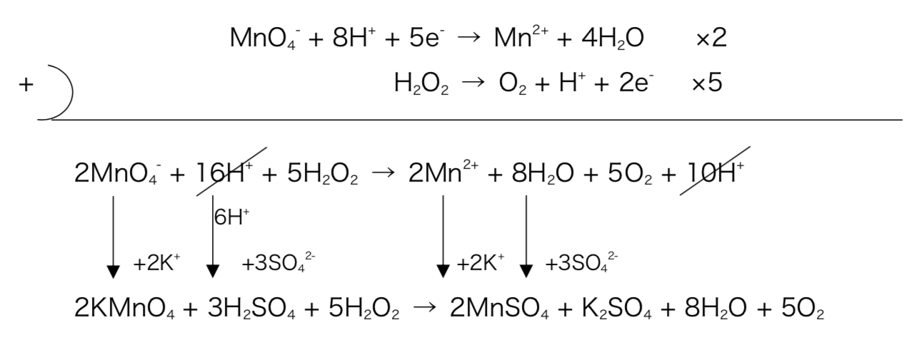 →MnO4–はMn2+へと変化させるためにOイオンを4つ取って還元させなければならないが、その際十分にH+が存在しないとMnイオンとOイオンの間にはたらくクーロン力を弱められないからだと考えられる。
