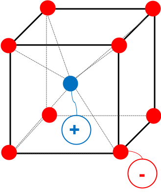 図4のように立方体の各頂点に、-イオン、立方体の中心に+イオンが配置された、くり返し構造がCsCl型である。