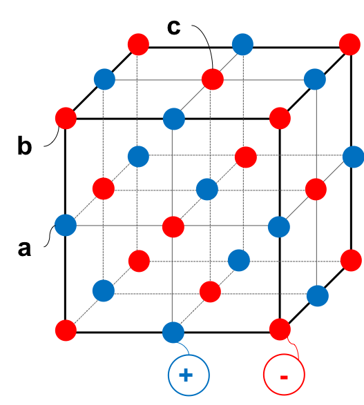 +と-が規則正しく配列し、そのくり返し単位を単位格子という。