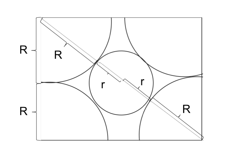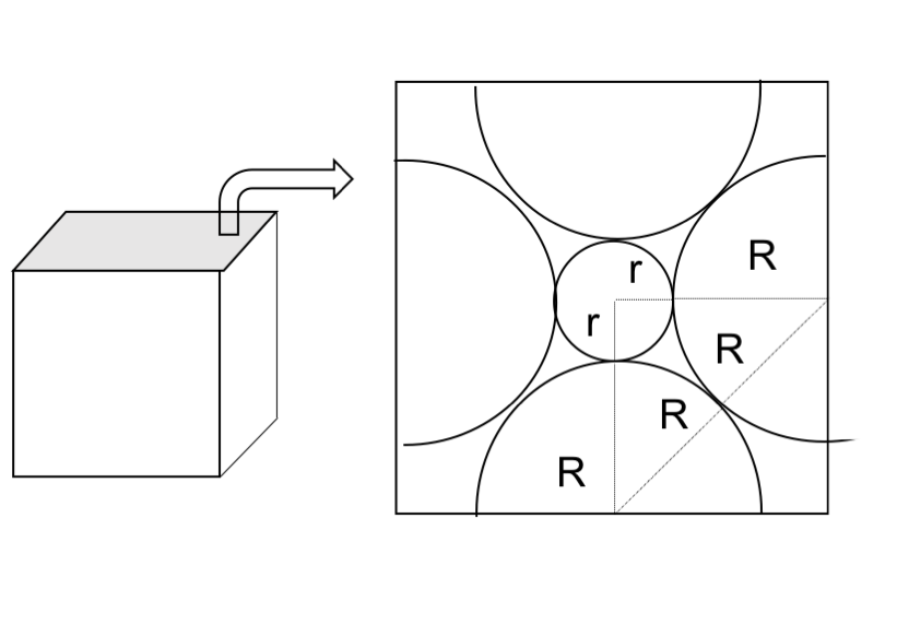 NaCl型の立方体の任意の一面を取り出して、+の半径をr、-の半径をRとおく。