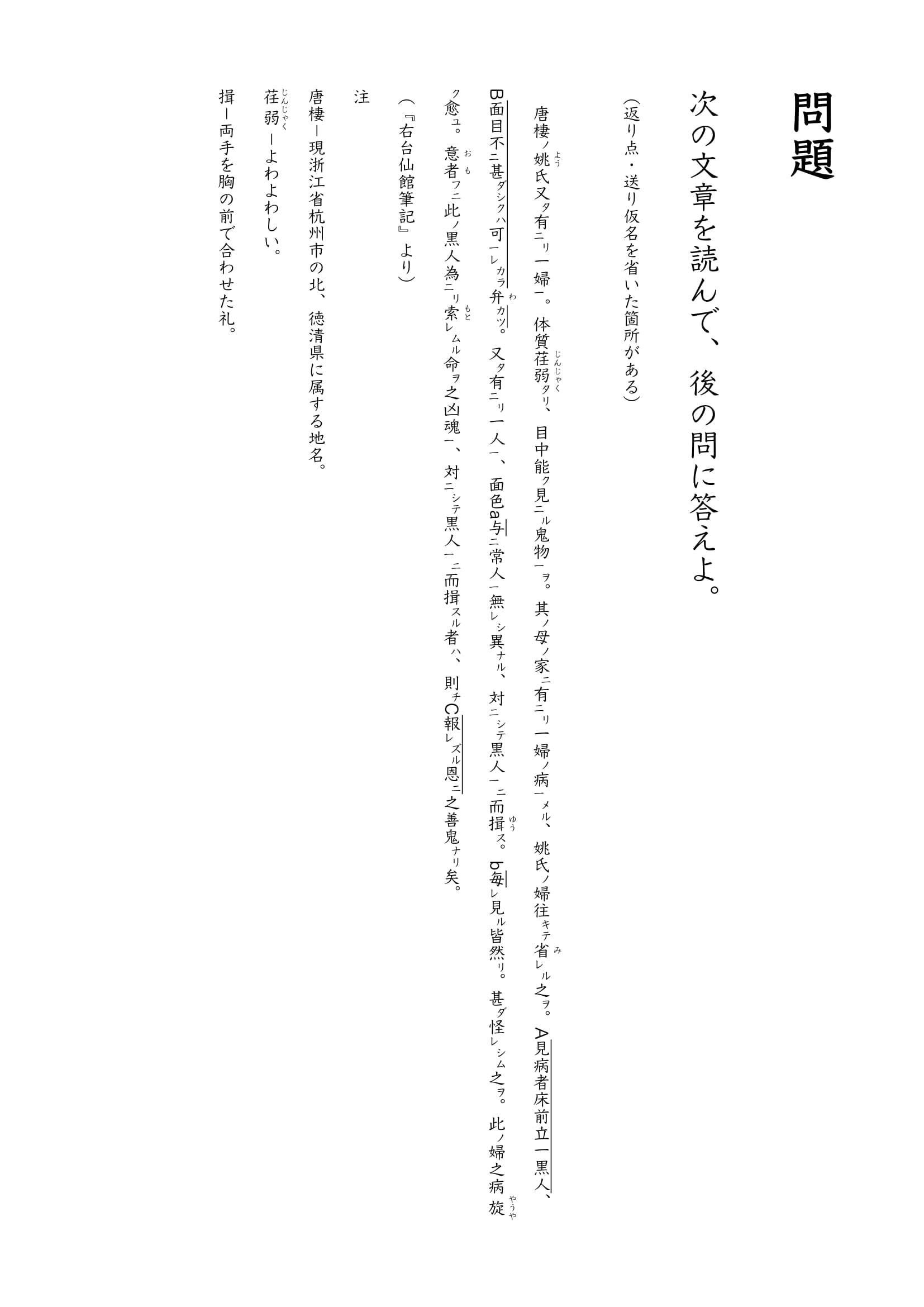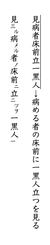 傍線Aを書き下し文にすると、「病める者の床前に一黒人立つを見る」となる。これをふまえて、「見」と「立」の部分に返り点を付けなさい。(送り仮名は不要である)