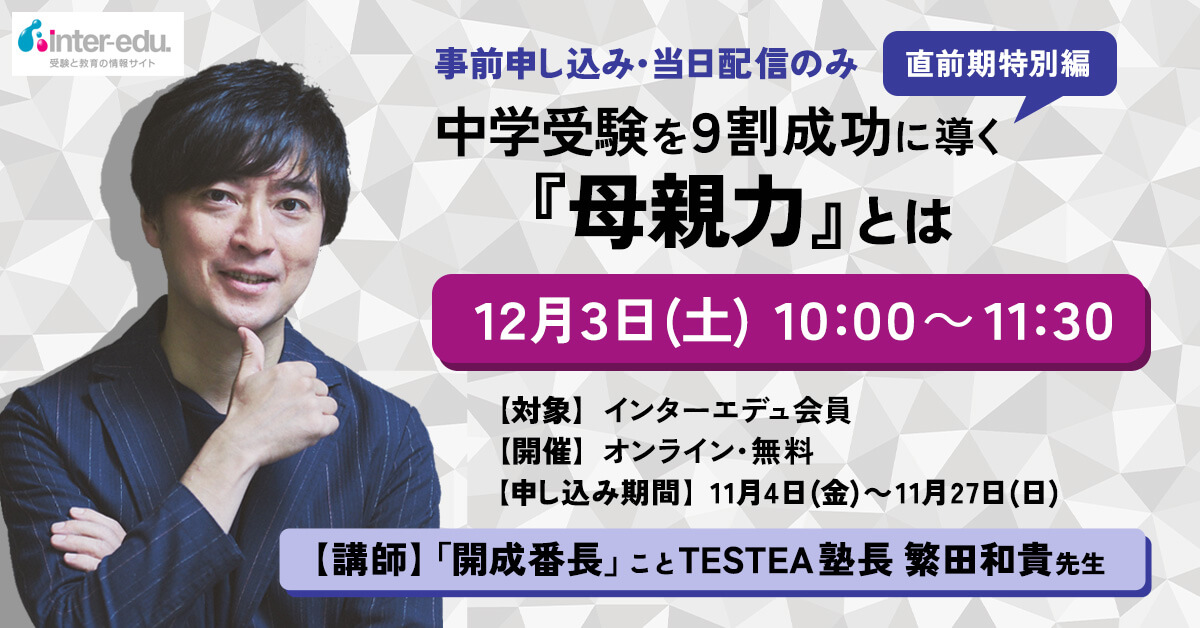 12月3日(土)に行われるインターエデュ会員限定オンラインセミナー 「≪直前期特別編≫中学受験を9割成功に導く『母親力』とは?」 にテスティー塾長繁田が登壇いたします。