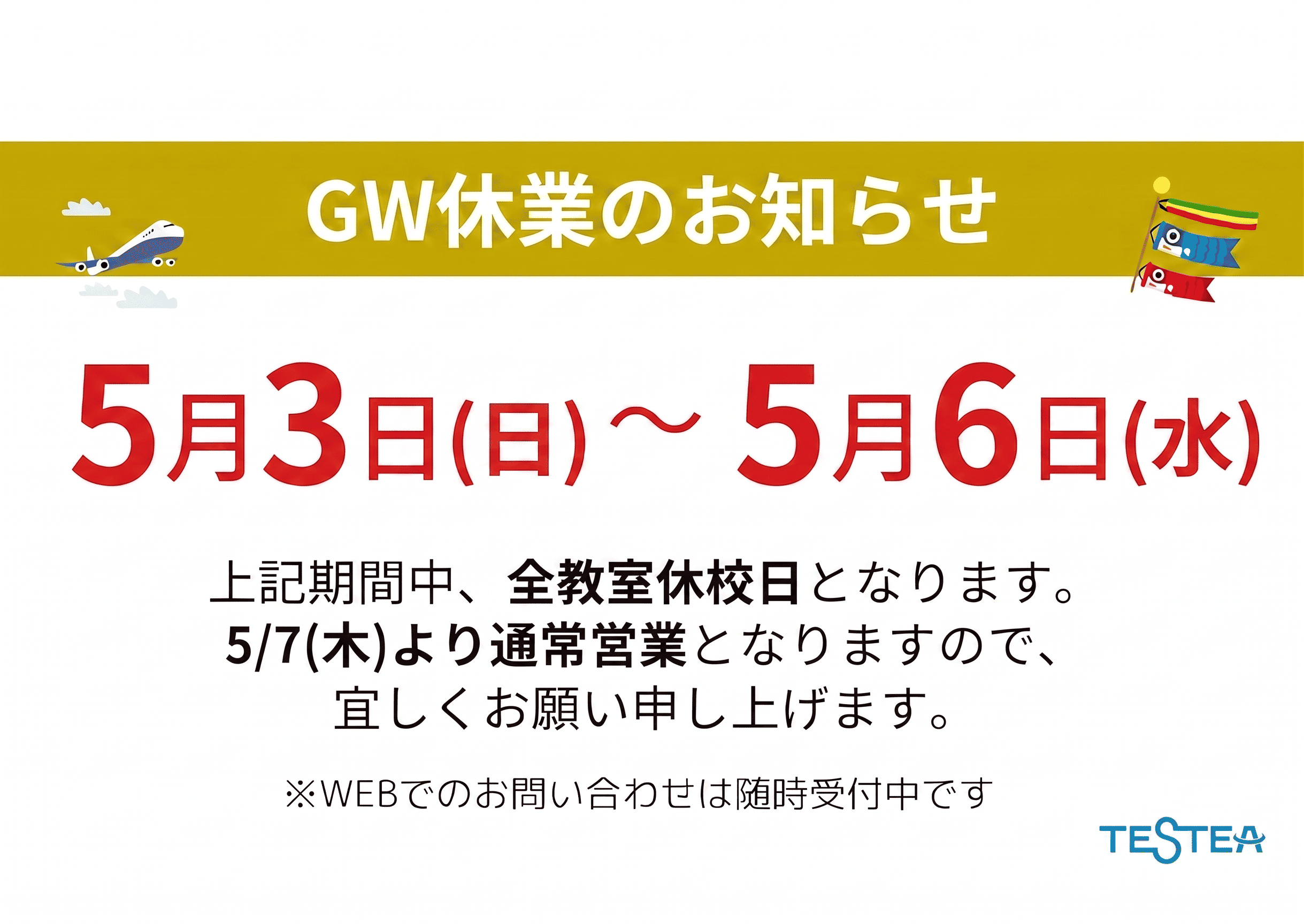 テスティーでは、以下の期間につきまして全教室で休校日とさせていただきますので、ご了承ください。